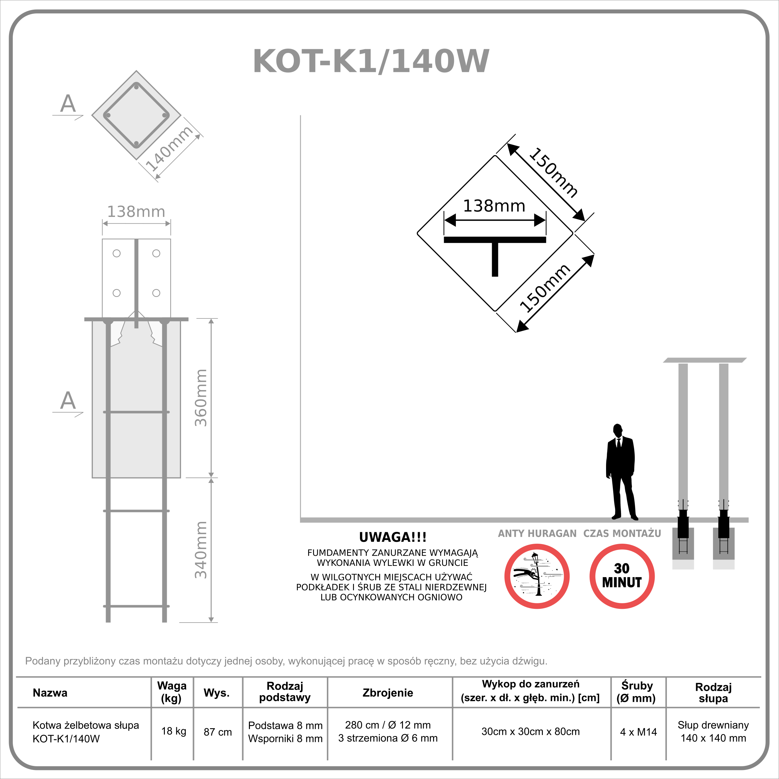 Śruby (max): M14; Blacha podstawy: 8mm; Zbrojenie: pręty żebrowane Ø12mm o długości całkowitej 280cm, 3 strzemiona Ø6mm. Części stalowe w całości ocynkowane ogniowo; Wykop do zanurzeń (szer. x dł. x głęb. [min]): 35cm x 35cm x 80cm. Do kotwy pasują podstawy do słupów drewnianych POD140W.