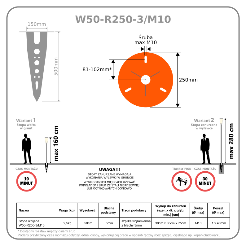 Śruby (max): M10; Blacha podstawy: 5mm; Szpilka: blacha 3mm spawana krzyżowo; Peszel max: 40mm; Stopa w całości wykonana ze stali, ocynkowana ogniowo; Max. wysokość instalowanych urządzeń (wersja wbijana): 160cm, Max. wysokość instalowanych urządzeń (wersja zanurzana): 280cm; Wykop do zanurzeń (szer. x dł. x głęb. min.): 30cm x 30cm x 75cm